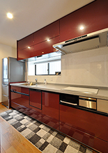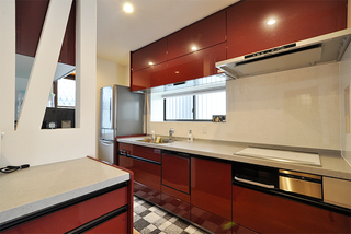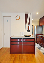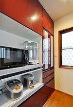 赤色のパネルが印象的なシステムキッチンはクリナップ/ステディア(W=2700)を採用。背面収納も同じメーカーで揃えました。洗濯室につながる出入り口はダイニング側に変更することで、ダイニング↔洗濯室↔洗面室と移動しやすくなっています。