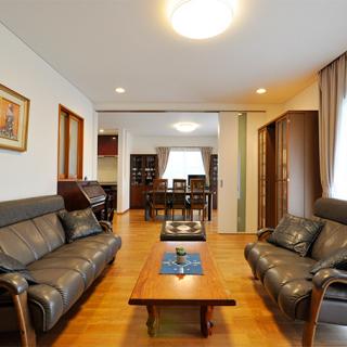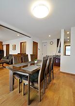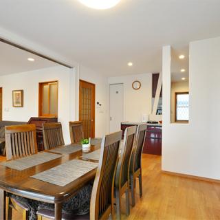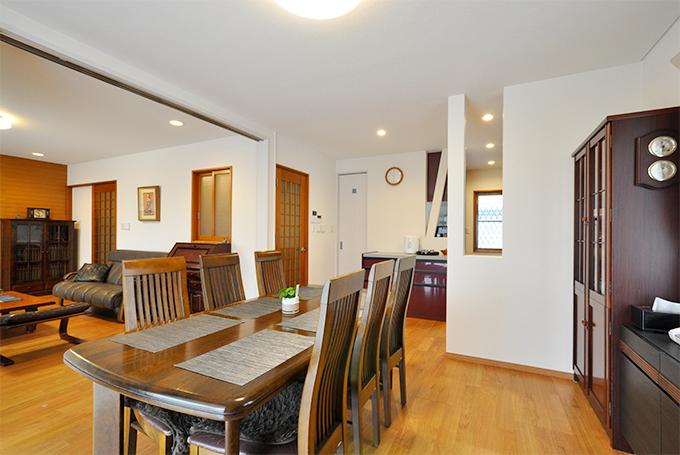 ダイニングとリビングを仕切る建具は天井までにし、袖壁を外壁側に移動したことで一体感がアップ。