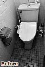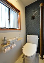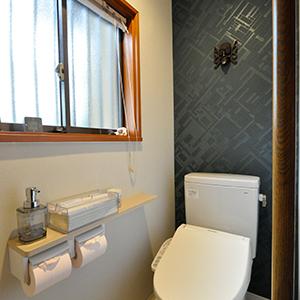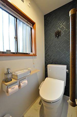 便器はTOTO/ピュアレストQRに取り替え。タイル貼りで寒く感じていた内装は、明るい雰囲気に一新。ダーク色のアクセントクロスで落ち着いた印象に。