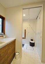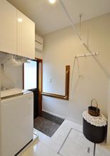 ダイニング側からと洗面室側からの2WAYでアクセス可能な洗濯室。動線を変え、スペースが広くなったので洗濯物が干しやすくなり、風通りも良くなっています。
