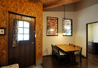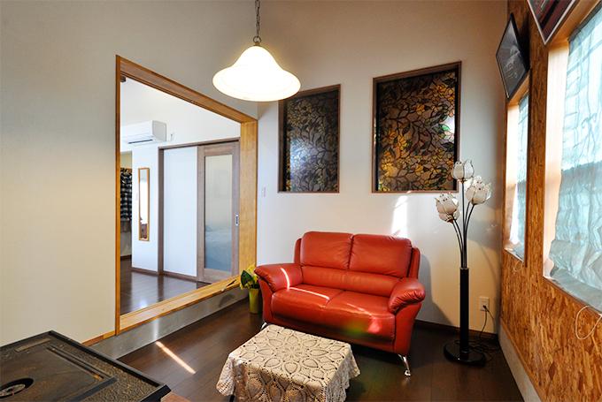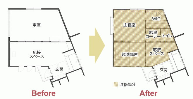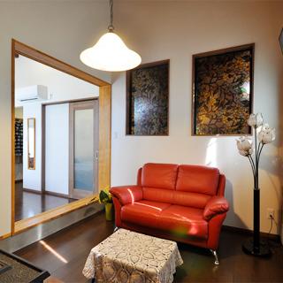 玄関を縮小し、リビングのあった空間は応接スペースと趣味部屋に分割。間仕切り壁にはFIXの窓(既設窓を転用)を設け、明るさを確保しています。床はフローリング仕上げに。