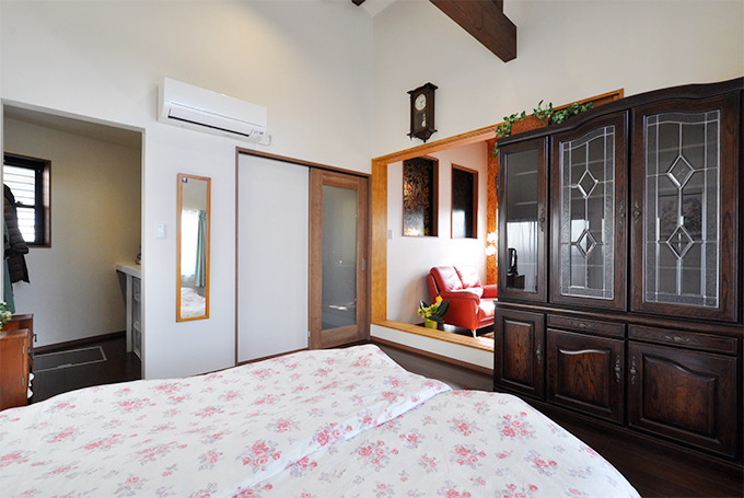 お母様との同居が決まり、安心して迎え入れられる住まいにしたいとお考えだったI様。手狭になるご夫婦の寝室や収納を新たに新設するため、車庫とリビングを改修することに。リフォームにあたってはプライベートな空間づくりだけでなく、来客があった際も大丈夫なように応接スペースを完備。寝室と応接スペースの間には給湯コーナー(ミニキッチン)を配することで、プライベートを確保しつつ、来客時のお茶出しができるなど、2つの空間のつなぎとして機能します。