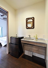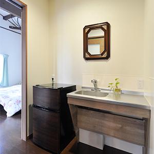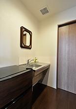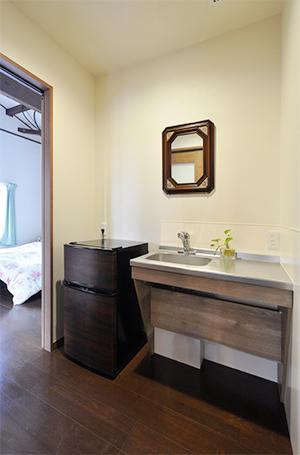 応接スペースと寝室の間に給湯コーナー(ミニキッチン)を新設。来客時のお茶出しがしやすくなり、戸を閉めればプライベート空間と仕切ることができます。