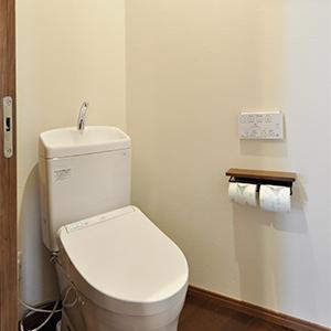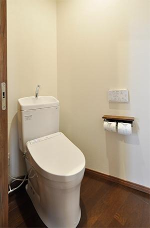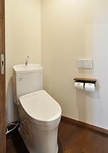 給湯コーナーを介して、寝室からも応接スペースからもアクセスできる位置にトイレを新設。便器は機能と価格とのバランスの良さで人気のTOTO/ピュアレストQR。