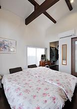 元は車庫だった空間を寝室+ウォークインクローゼットに。シングルベッドを2台置いてもスペースに余裕があり、天井は梁を表しにしているのでとても開放的です。