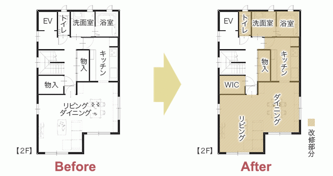 | リフォーム箇所 | リビング、ダイニング、キッチン、浴室、トイレ、洗面室、ウォークインクローゼット、物入 |