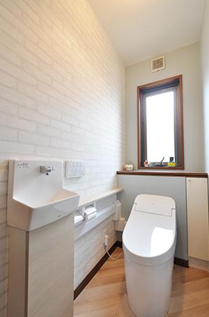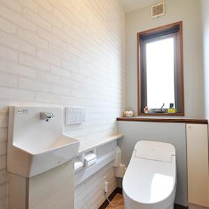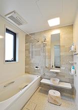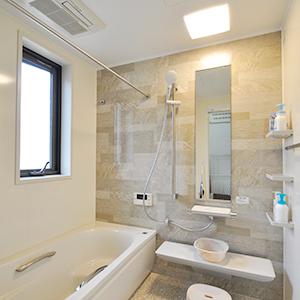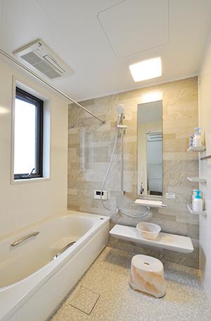 浴室はTOTO/サザナ(1618サイズ)を選択。ご主人こだわりの壁カラーと使いやすい位置に手すりを設けて、安心してゆっくりと寛げるお風呂に。