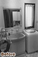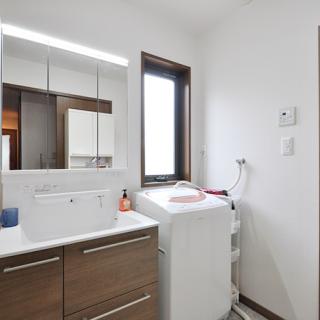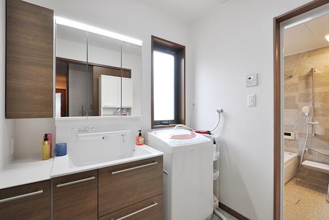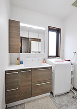 収納が増えて使いやすくなった洗面化粧台(TOTO/オクターブ、化粧台W750+収納W250)。お風呂との一体感が生まれるよう、お風呂と色目と合わせた落ち着いたトーンに。