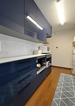 システムキッチンはブルーのパネルがスタイリッシュなTOTO/ザ・クラッソ(W=2630)。背面収納も同じメーカーで統一。背面収納には配膳等で利用できるように広々としたカウンターを設けています。家電やゴミ箱もスッキリと収まり、使いやすさがグッと向上しています。