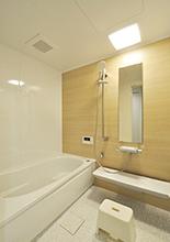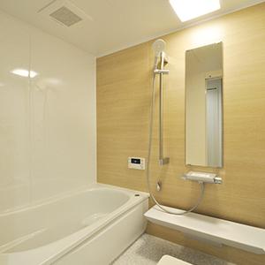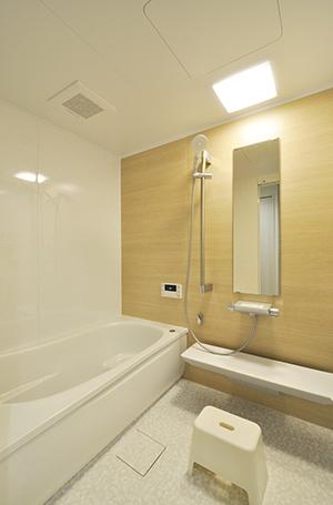 浴室はTOTOのマンションリモデル(1418サイズ)に取り替え。清掃性がよいのでお手入れが簡単。アクセントパネルはナチュラルな雰囲気のライトウッドにして、他の部屋とのイメージを合わせています。