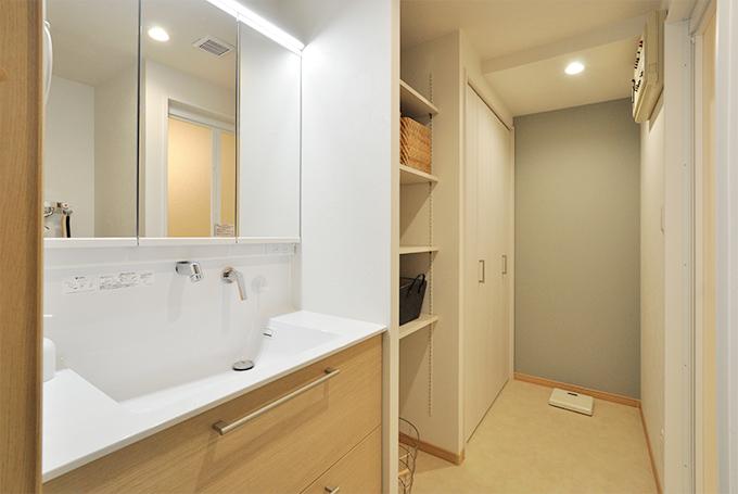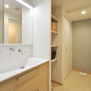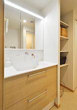 洗面化粧台は機能性に優れ人気のTOTO/オクターブ(W=900)。オープン棚と扉付きと用途に合わせて使い分けできる収納が並んで2つあり、収納力は抜群です。洗面のパネルは浴室のものと合わせてライトウッドを選択しています。