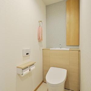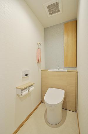 トイレはスッキリしたデザインのTOTO/レストパル。細やかな花柄のクロスをアクセントにして可愛らしい内装に。