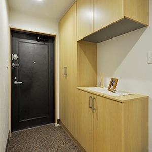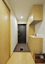 収納量のあるコの字型の玄関収納を設置。照明は人感センサーで自動ON/OFFだから消し忘れの心配もありません。玄関の色味もライトウッドで統一しています。