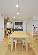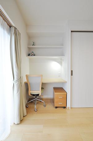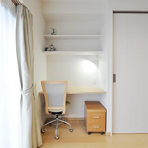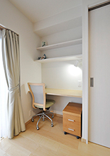 ナチュラルな雰囲気がお好みで、インテリアはお手持ちの家具と合わせて、メープル色とホワイトでトータルコーディネート。ダイニングの一角には、奥様の在宅ワーク対応のワークスペースを完備。その横には可動棚で様々な大きさの物に対応できる、引き違い扉の収納をレイアウトしました。メゾネットの間取りであったり、高層階だからこその眺望のよさだったりも相まって、納得感や満足度の高い新居となりました。