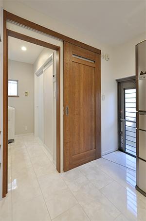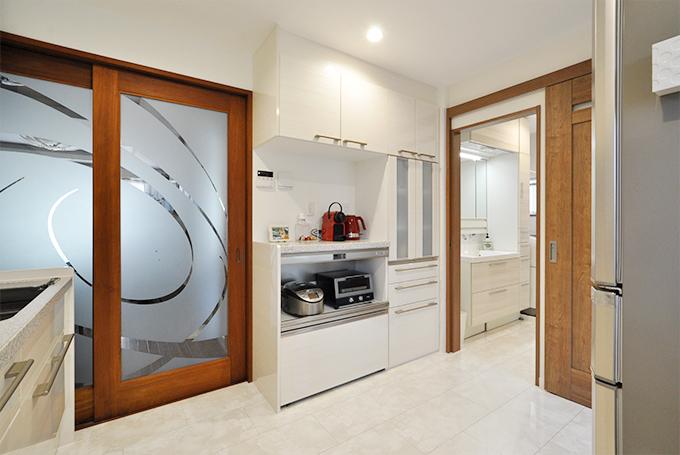 キッチンはLIXILの最上位グレード、リシェルSI(W2550)。炊飯器やトースターが並ぶ背面収納も同じリシェルシリーズで揃えました。床材はキズや汚れに強い、高級感のある石目柄のフローリングを採用。床下には断熱材を入れ、ガス温水式床暖房も敷設。洗面脱衣室やリビングともフラットにつながるので、お掃除ロボットもスイスイ移動できます。