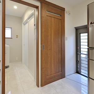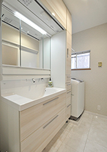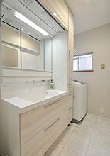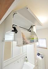 洗面化粧台は横幅をすこしコンパクトにして、洗濯機との間に天井まであるトールキャビネット(LIXIL/L.C.18)を設置。化粧台上にも昇降式の吊戸を取付け収納力をアップ!キッチンとも段差なくフラットにつながります。