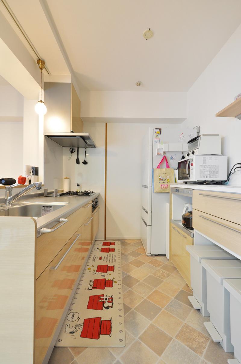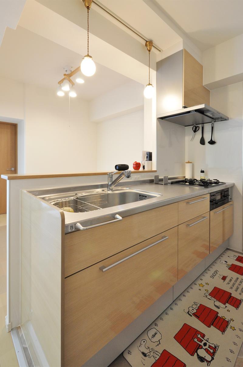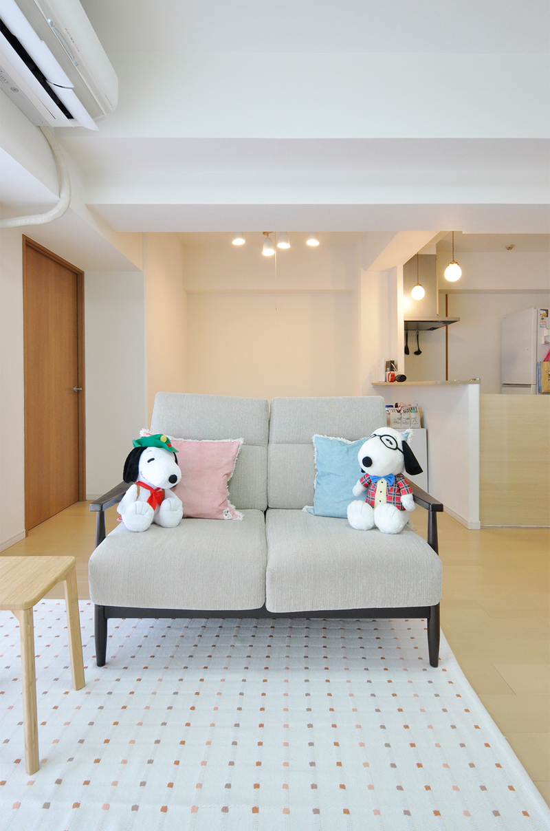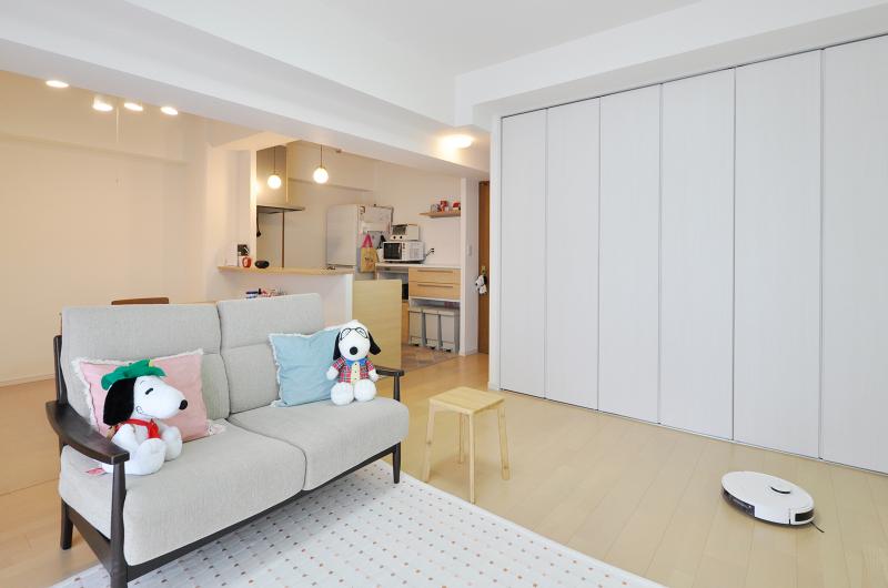 お互いの職場へのアクセスがよく、ご主人の実家が近く、住み慣れたエリアの中古マンションを購入。リノベーションではご夫婦共通の趣味であるスヌーピー柄のアクセントクロスを取り入れたり、賃貸住まいの時に経験した収納不足にならないようにと豊富な収納(パントリーやウォークスルークローゼット)を導入したり、家族とコミュニケーションが取りやすいオープンな対面キッチンにしたりと、ご要望を叶えられました。