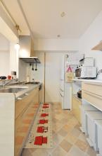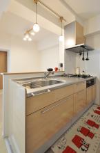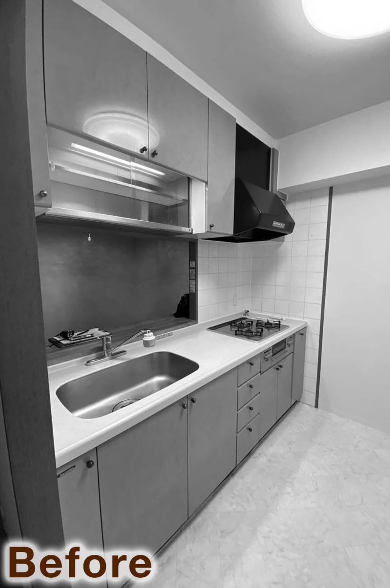 システムキッチンはHousetec/LE(W=2250)を設置。位置やサイズはそのままに、垂れ壁や袖壁をなくして解放感アップ。キッチン上の吊り戸をなくした分は背面収納で確保。メーカーはキッチンと同じHousetec/LE(W=1500)。