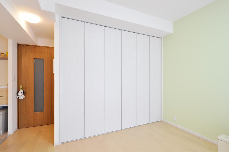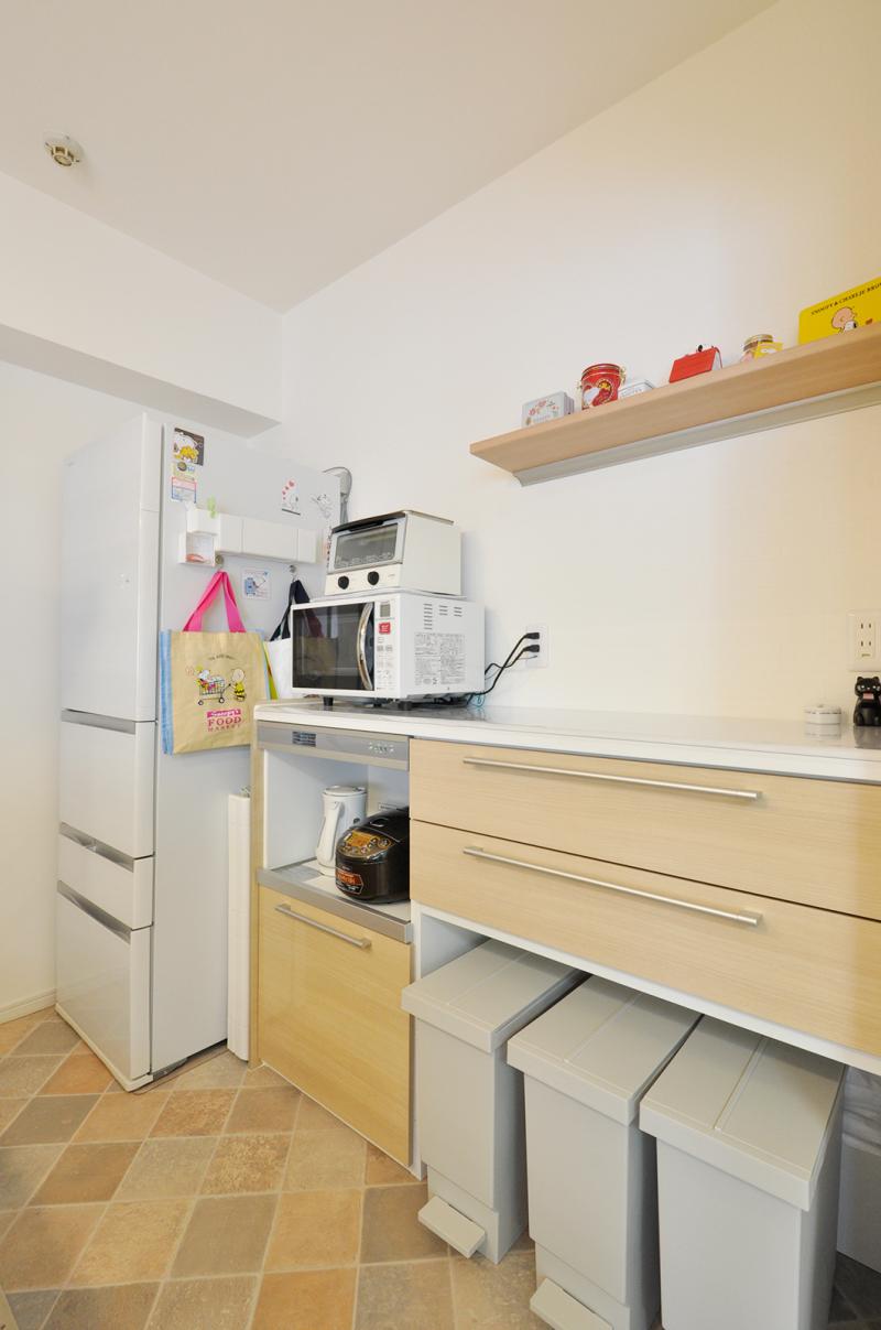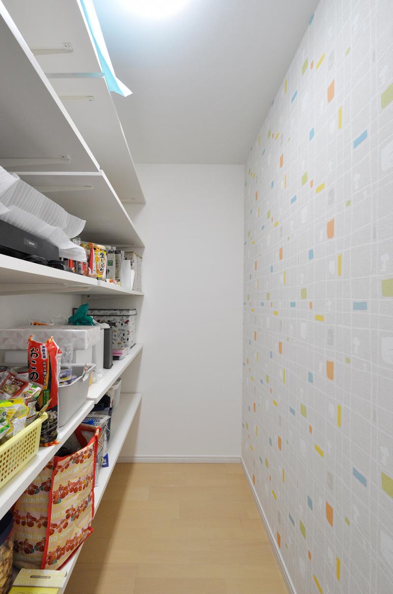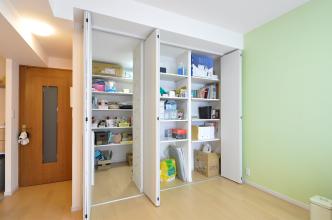 リビングには収納がまったくなかったため、和室をなくしてリビング収納&パントリーに。リビングはグリーンクロス、パントリーはスヌーピー柄のクロスで遊び心をプラス。