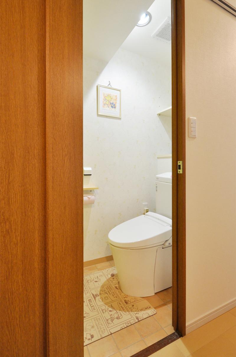 トイレはLIXIL/アメージュZ便器(フチレス)を採用。アクアセラミックでキレイが長続きする点と、フチがなく汚れがサッと拭き取れる点がお気に入り。壁紙にもさりげなくスヌーピーが隠れています。