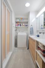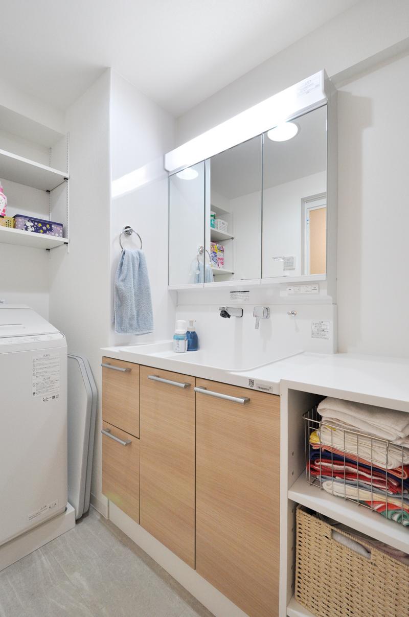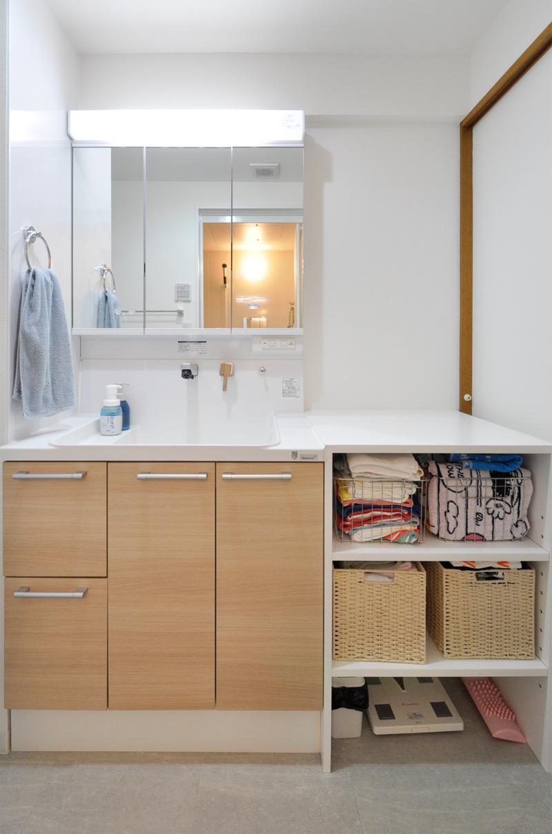 洗面化粧台はHousetec/ココッシュ(W=750)。水撥ねしにくいボウルや水垢がたまりにくい水栓など、使いやすい工夫がいっぱい。横には造作棚を設置し収納力もアップしています。