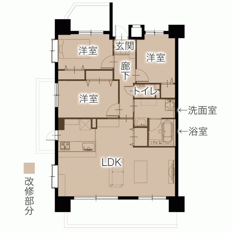 | リフォーム箇所 | リビング、ダイニング、キッチン、浴室、トイレ、洗面室、寝室、洋室、玄関、廊下 |