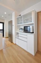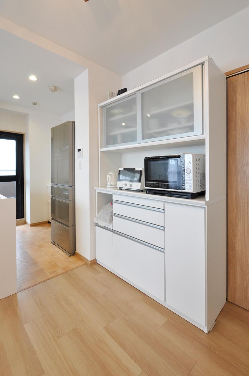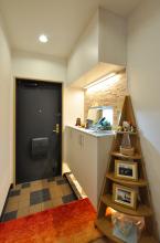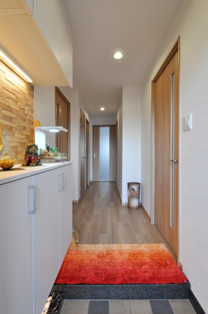 玄関収納は圧迫感の少ないセパレートタイプをチョイス。ポイントで貼られたDAIKEN/グラビオエッジやキャビネット下に取り付けた照明がおもてなしの空間を演出しています。