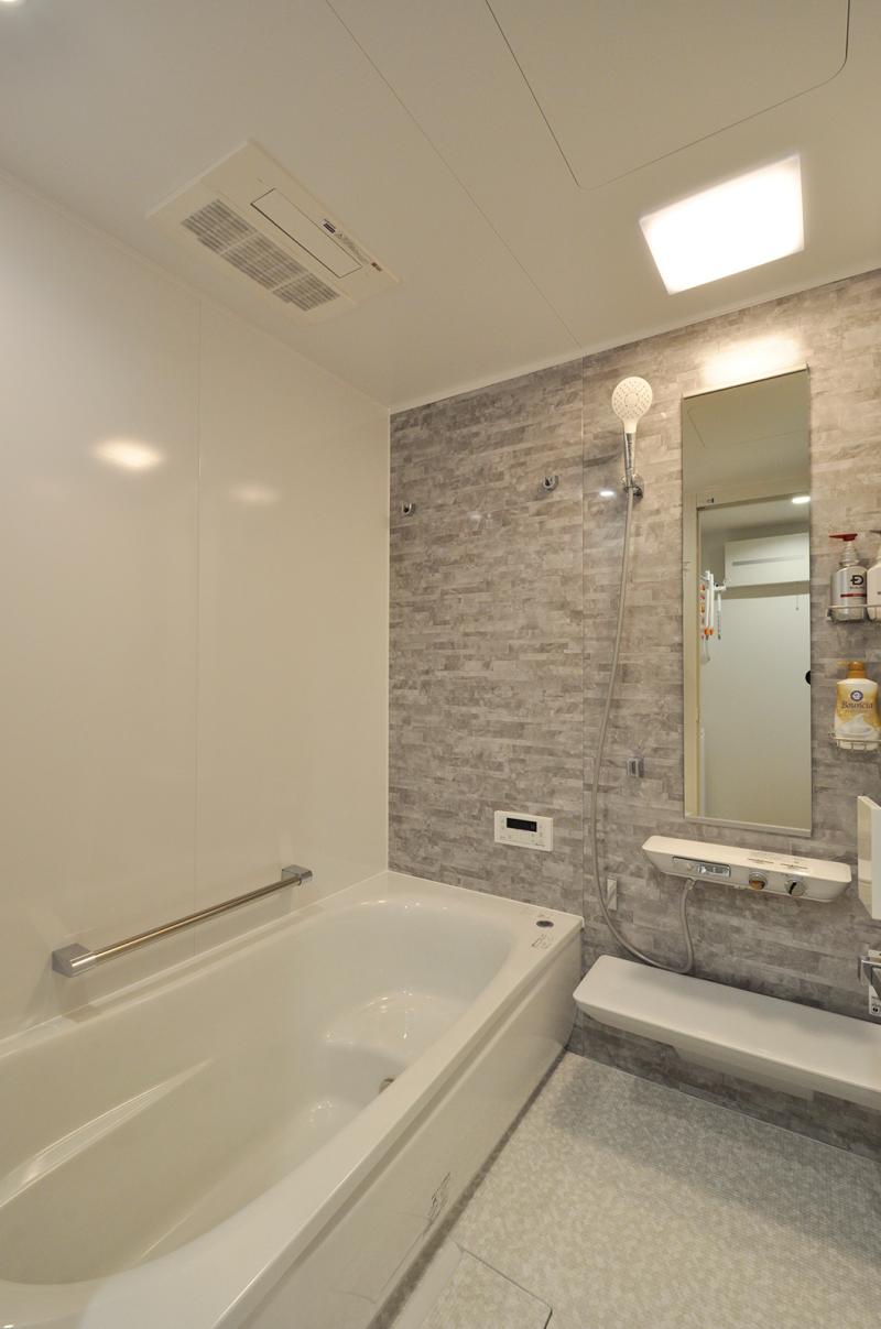 マンションの最上階で天井高が確保できたため、間取りを変更して1616サイズのTOTO/サザナを設置。正面パネルは石目調のクレアライトグレー。床はラグ調ホワイト、浴槽はジェエリーホワイトNを選び、清潔感と高級感のある空間に。ガス式の浴室暖房乾燥機を備え、雨の日や夜の室内干しもストレスなく行えます。お掃除ラクラクほっカラリ床、人大浴槽、人大エプロン、床ワイパー洗浄などをセレクトし、毎日のお掃除の負担も軽減されます。