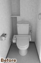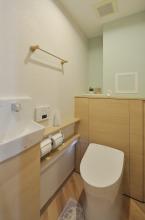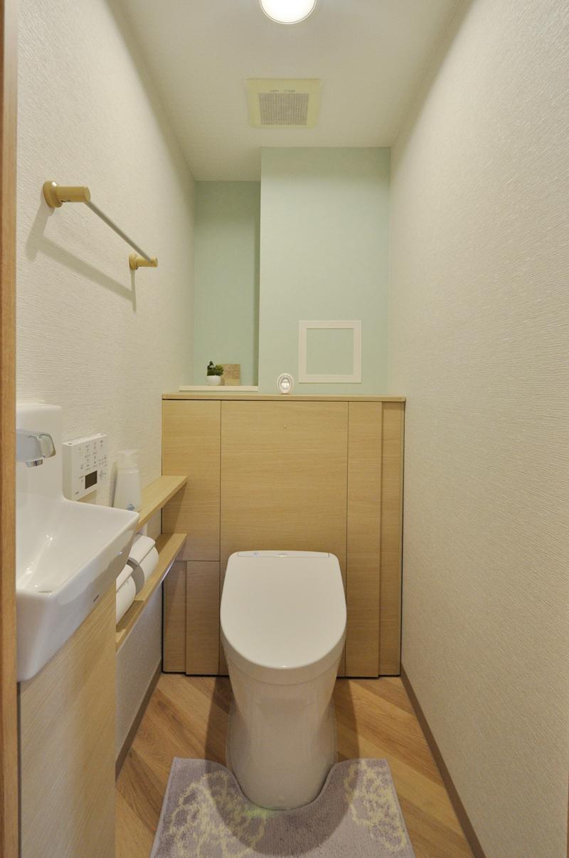 トイレはTOTO/レストパル。タンク部分がキャビネットで覆われているため、収納力と清掃性のどちらも◎。ヘリンボーン調のクッションフロアやペールグリーンのアクセントクロスで明るく爽やかな空間に。手洗い器は自動水栓にしています。