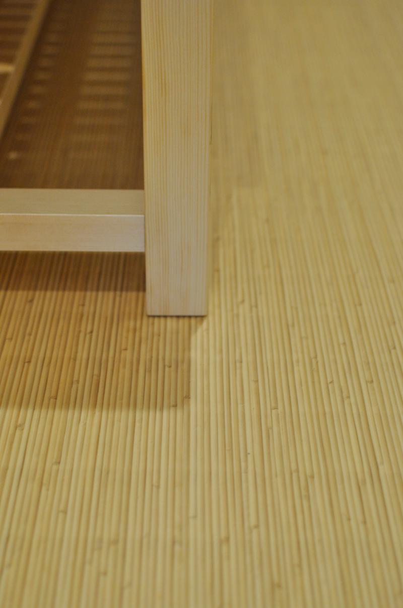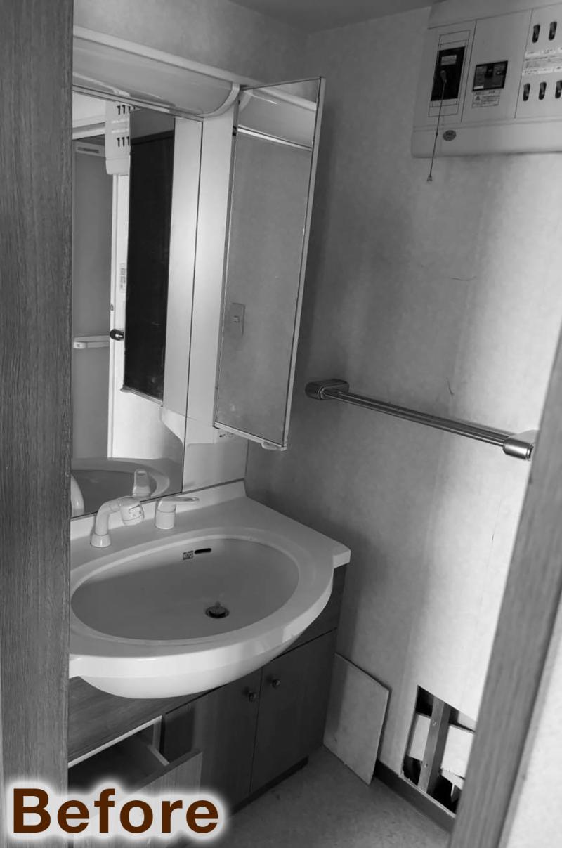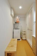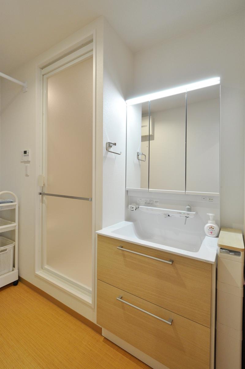 洗面室は洗濯機横に脱衣カゴが置けるスペースを確保。洗面化粧台は自動水栓で衛生的に手洗いができるTOTO/オクターブ(W=750)を設置。銭湯を思わせるバンブー調のクッションフロア、お気に入りの木製ベンチとの相性も抜群で、見た目にもくつろげる空間となりました。