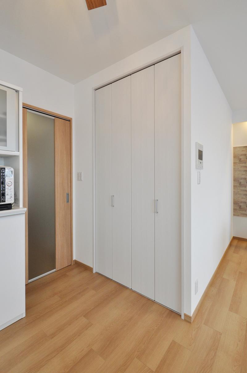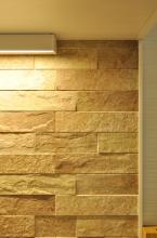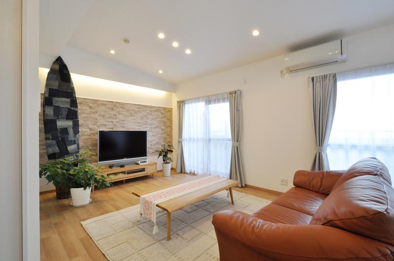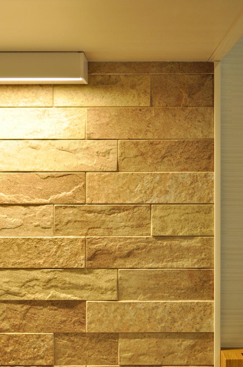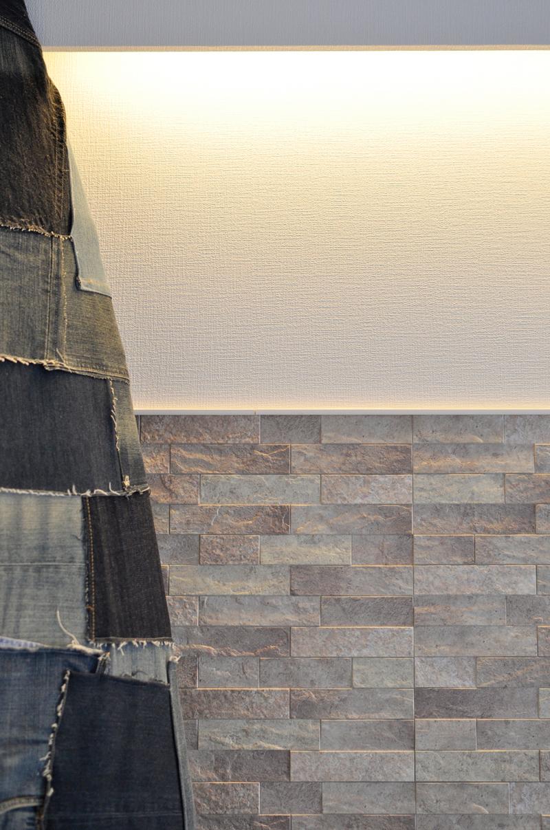 お風呂と洗面室を広げたことで、以前のリビング収納はなくなりましたが、間取りを工夫して新たに物入れを設置。テレビ背面には装飾不燃壁材のDAIKEN・グラビオエッジを貼り、本物のタイルのような色ムラや凸凹がアクセントに。上部の間接照明が壁面の陰影を作り出します。