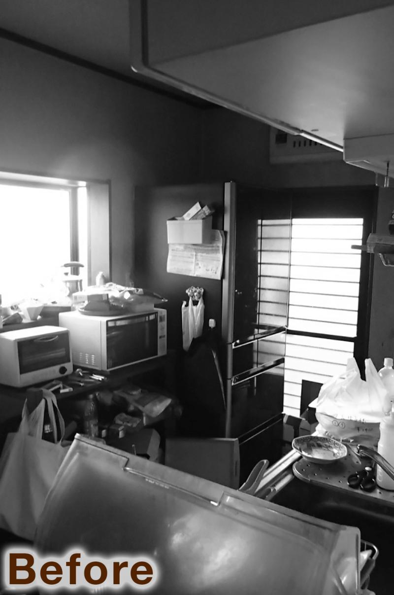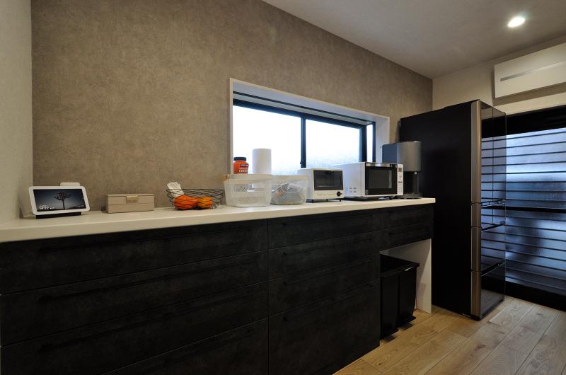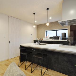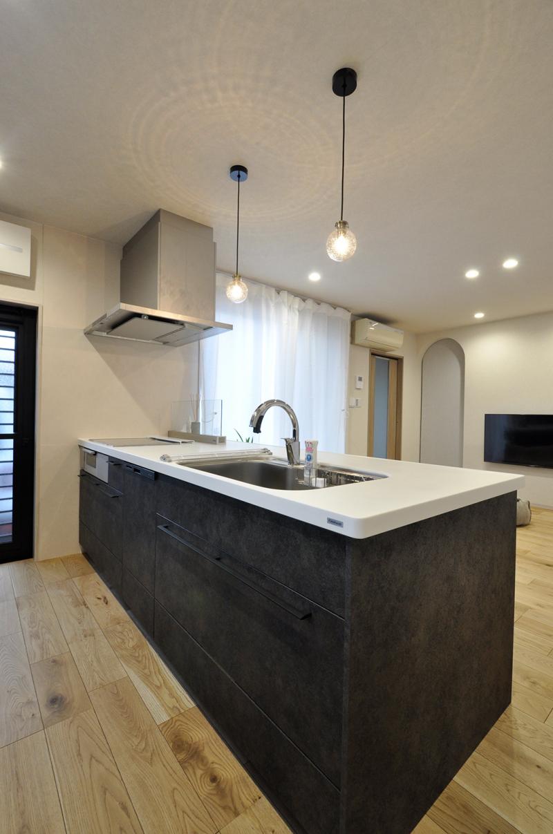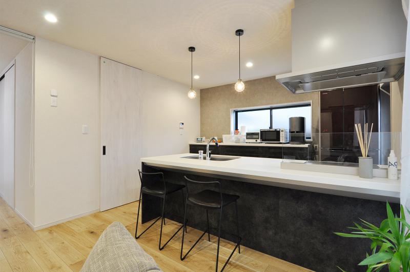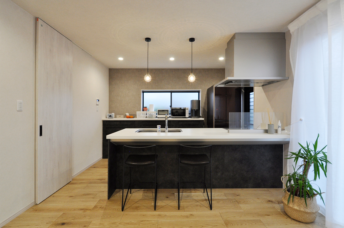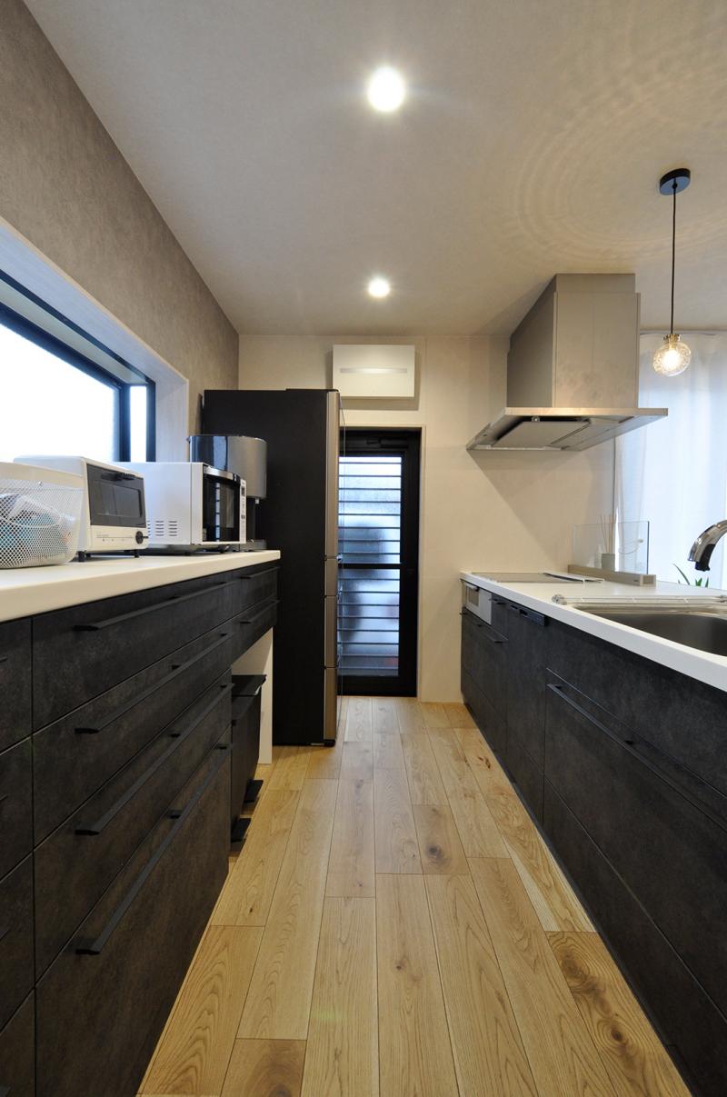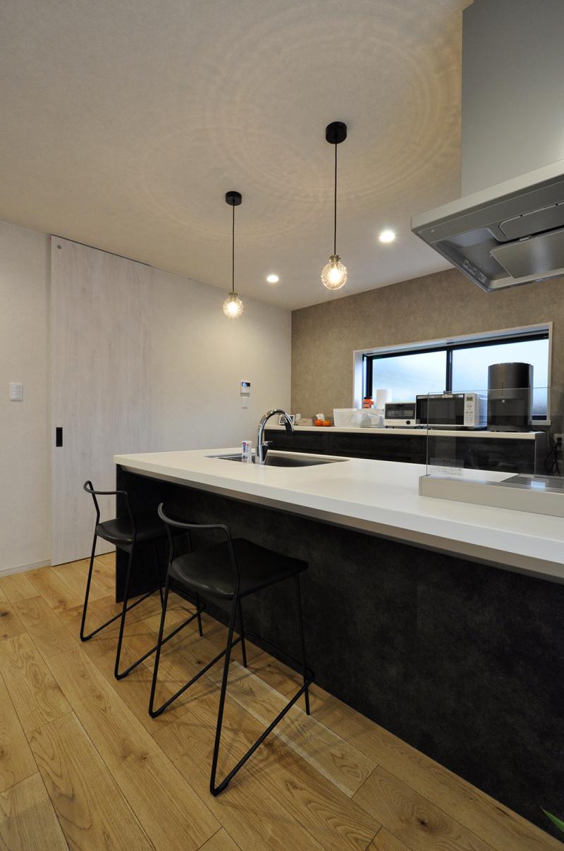 レイアウト変更はせずにフルフラット対面にして、カウンターで食事ができるスタイルへと変更。アイアンのような重厚感を感じさせるシステムキッチンはクリナップ/ステディア(W=2590)。背面には家電やゴミ箱がスッキリと収まるカウンター収納(クリナップ/ステディア)を配置。お手入れしやすいIHコンロも採用しています。