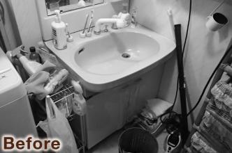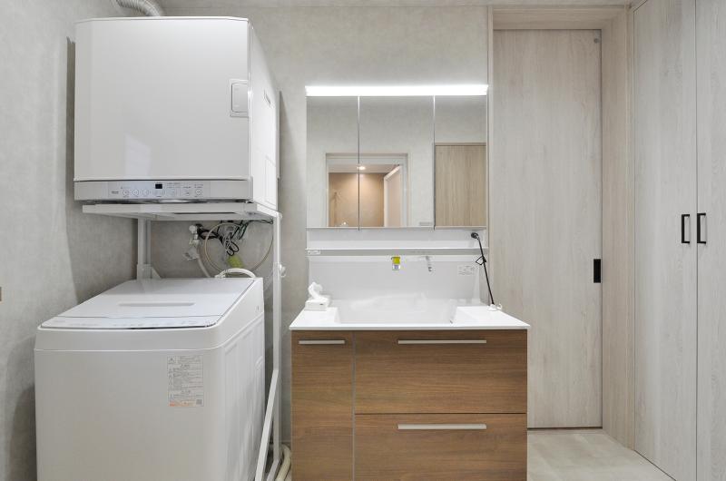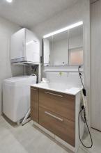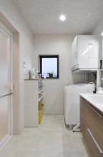 トイレの廊下スペースを取り込んで広さがアップした洗面脱衣室。化粧台はTOTO/オクターブ(W=900)を設置。ホームランドリーとして人気の乾太くん(ガス衣類乾燥機)も導入しています。