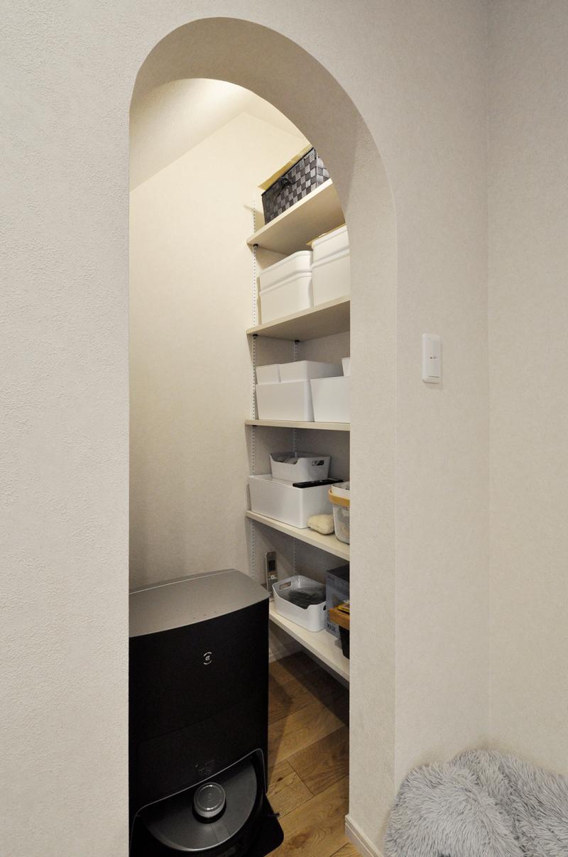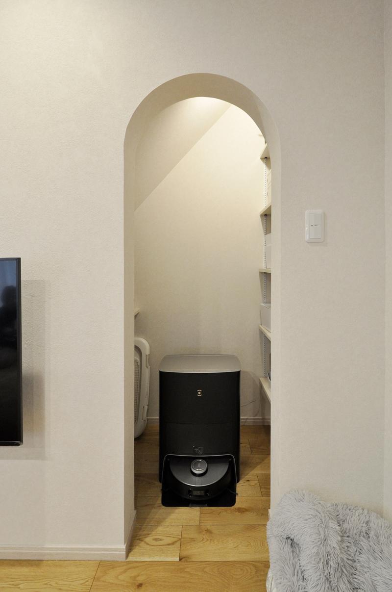 階段を上がって2階右側には6帖の洋室が2部屋ありましたが、12.5帖の洋室+ウォークインクローゼット(壁一面に可動式の棚とハンガーパイプを取り付け)へとリフォーム。階段下はR開口のかわいらしい小さな収納。ロボット掃除機のおうちにもなっています。