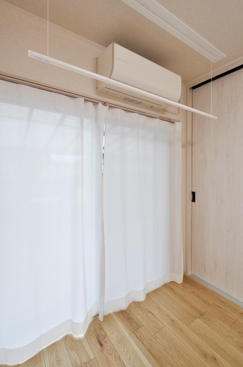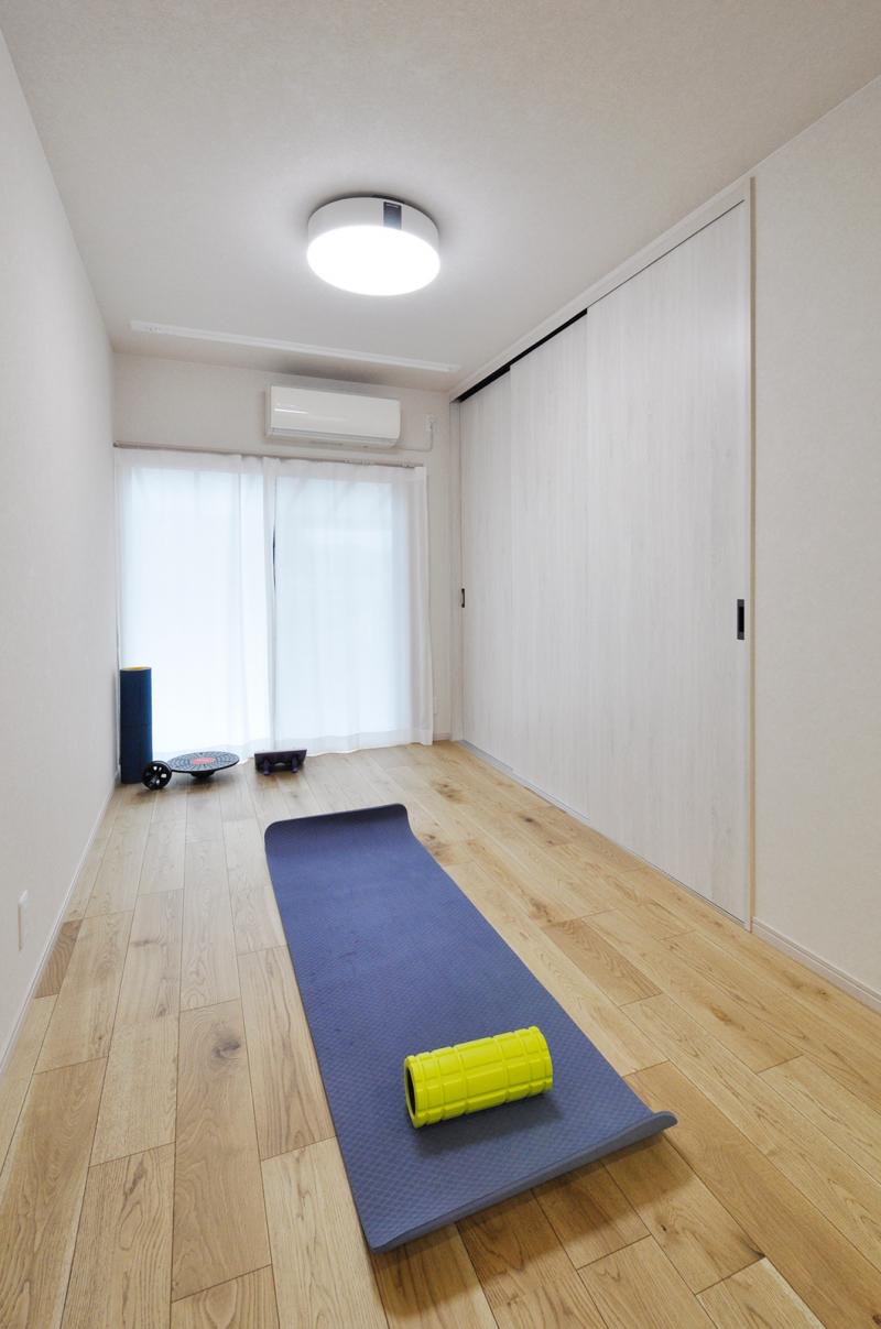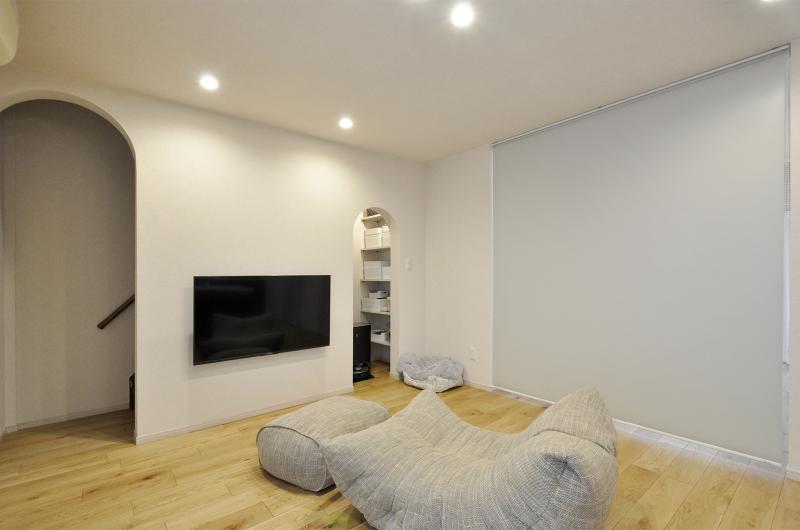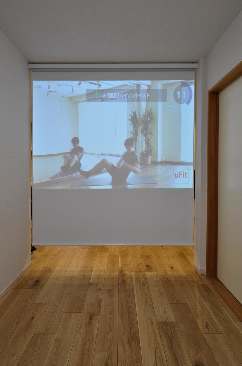 リビング奥の空間はトレーニングや美容院の着付けができるスペース。ロールスクリーンはプロジェクター投影用のスクリーンとしても利用できるものにしています。収納可能な物干しを設置しているので、着付けだったり室内干しで利用可能です。