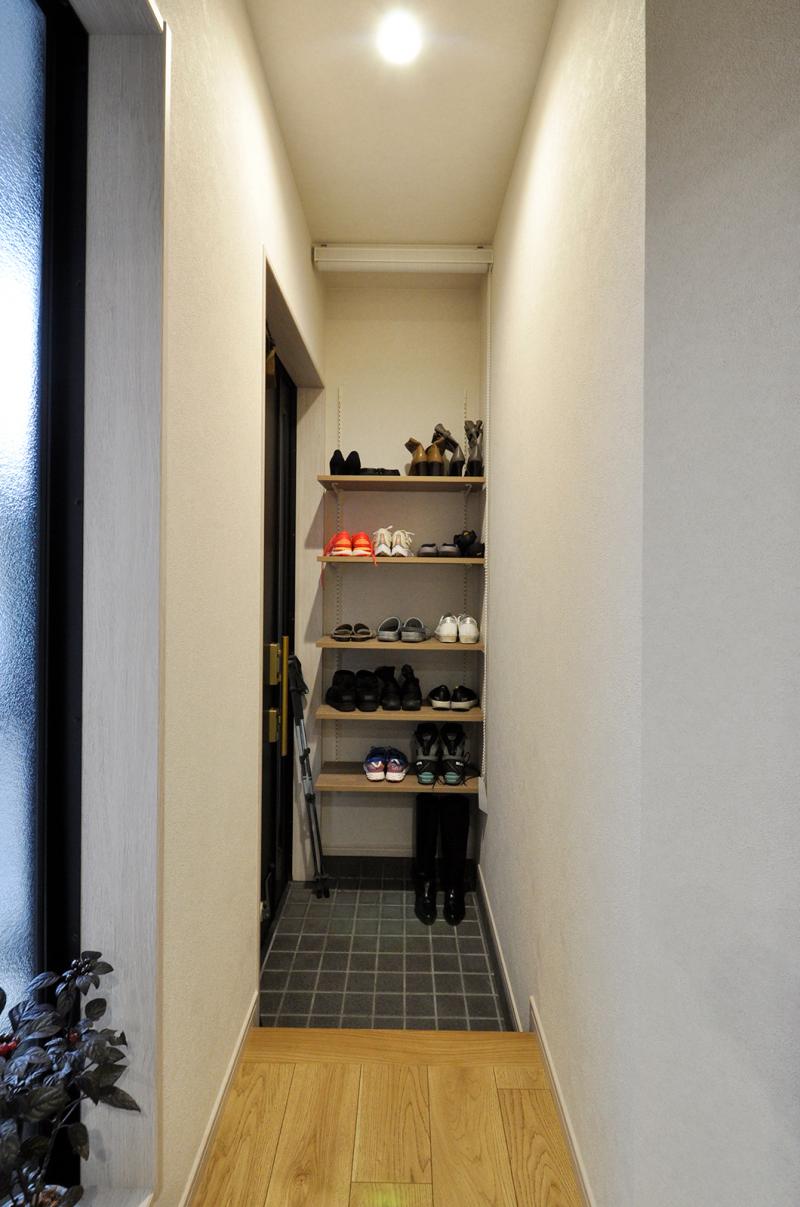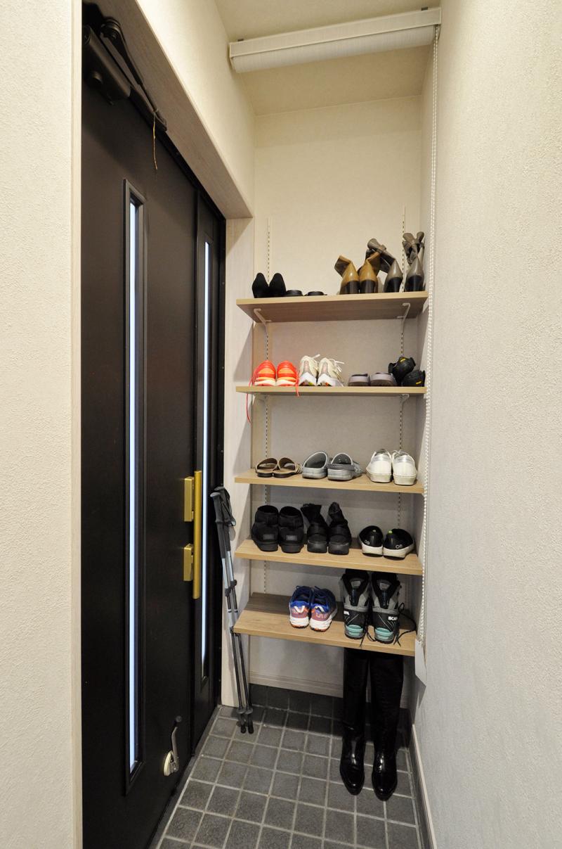 玄関収納として靴用の可動棚を取り付け。ロールスクリーンも設置して目隠しもできるようになっています。