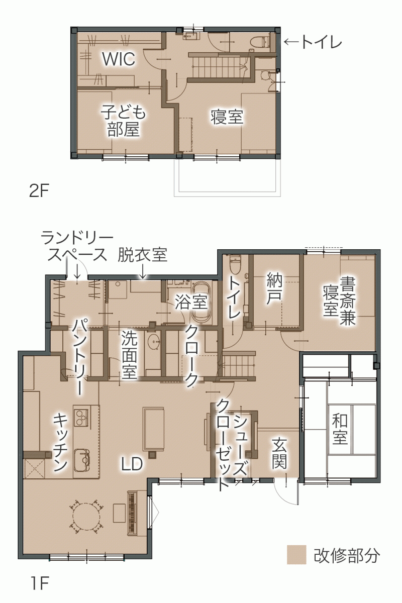 | リフォーム箇所 | 1F(リビング、ダイニング、キッチン、浴室、トイレ、洗面室、脱衣室、寝室、玄関ホール、パントリー、ランドリースペース、シューズクローゼット)、2F(寝室、トイレ、ウォークインクローゼット |