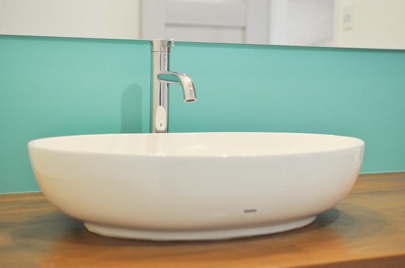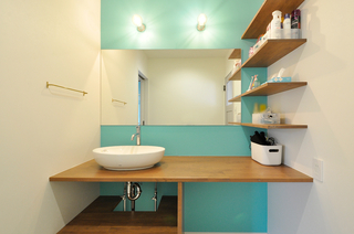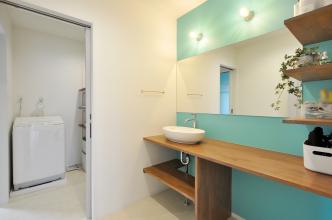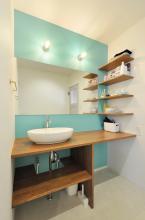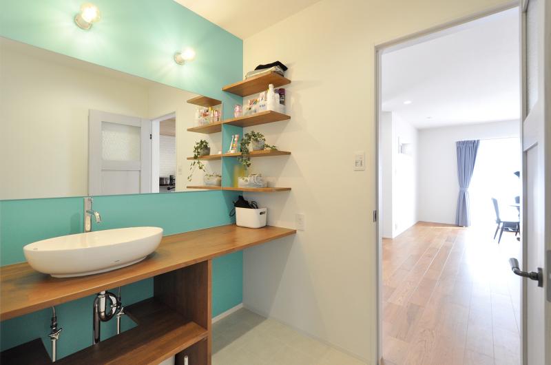 ティファニーブルーのアクセントウォール、素朴な丸みのある洗面ボウル、ウォールナット色の集成カウンター、アンティークなブラケットライトで西海岸風に仕上げた洗面室。リビングと脱衣室のどちらからもアクセスできます。