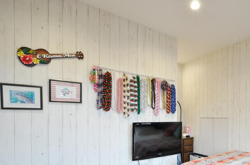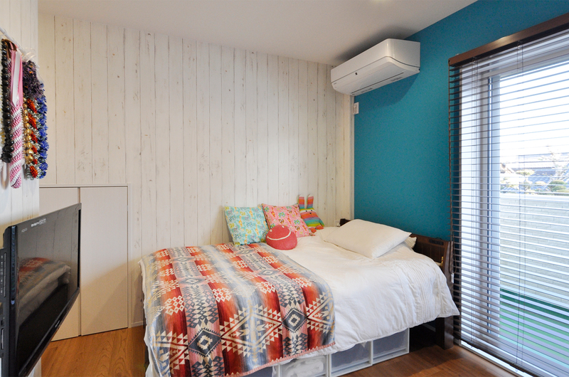 和室だった2階南西のお部屋は奥様の寝室。ホワイト木目×カリフォルニアブルーの壁紙にウッド調のブラインドを合わせ、西海岸風を感じる空間に。