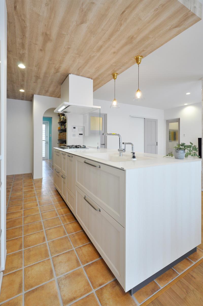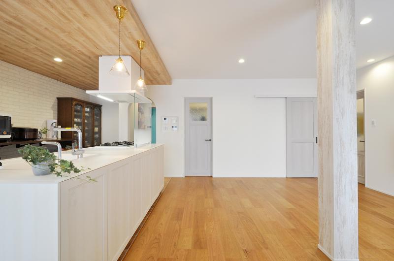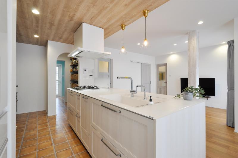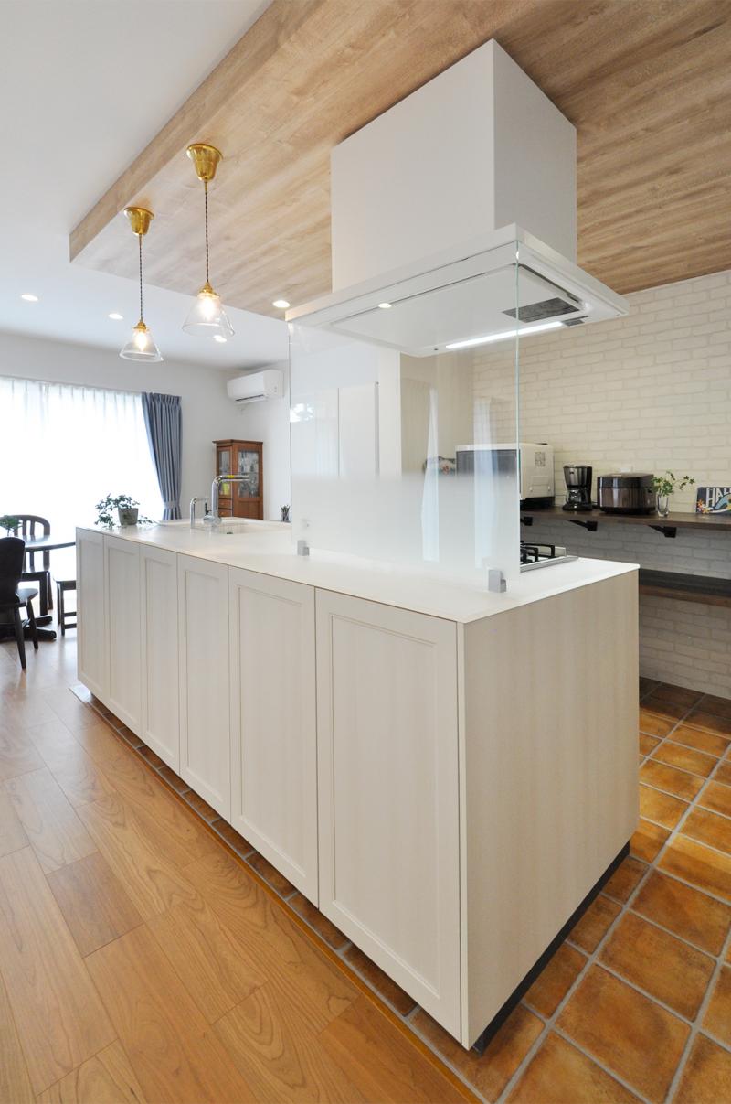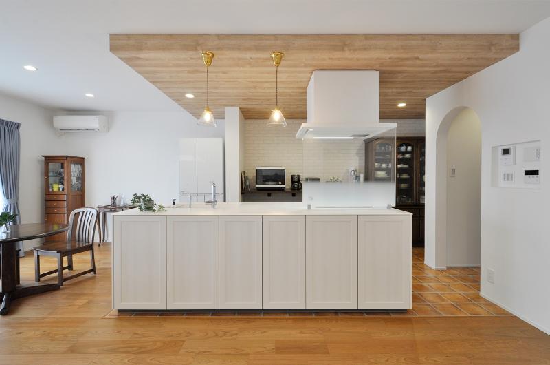 ホワイトカラーのフルフラットキッチン(TOTO/ザ・クラッソ)と、木目の下がり天井が目を引くアイランド型キッチン。ガラスタイプのレトロなペンダントライトは、奥様こだわりの逸品。背面収納カウンターは素朴な集成材、ホワイトレンガ柄のアクセントクロスでナチュラルな印象に