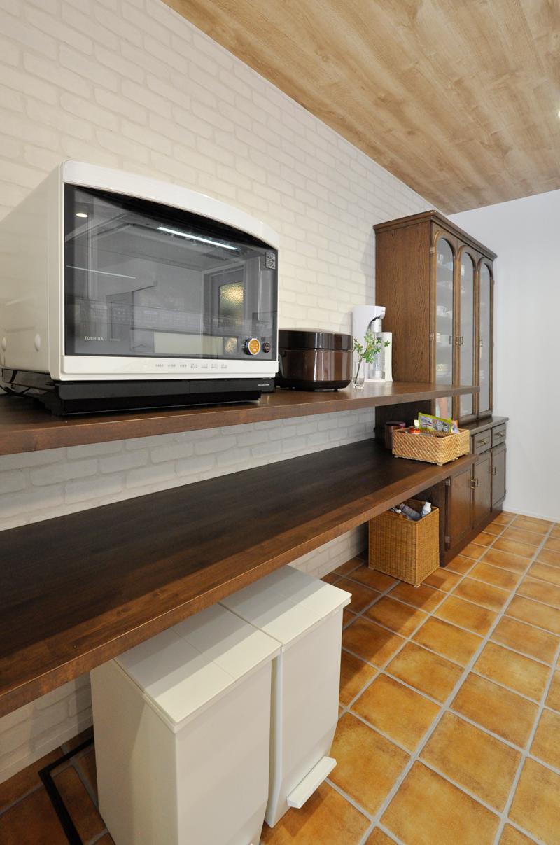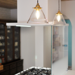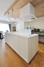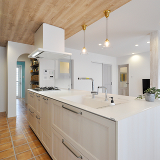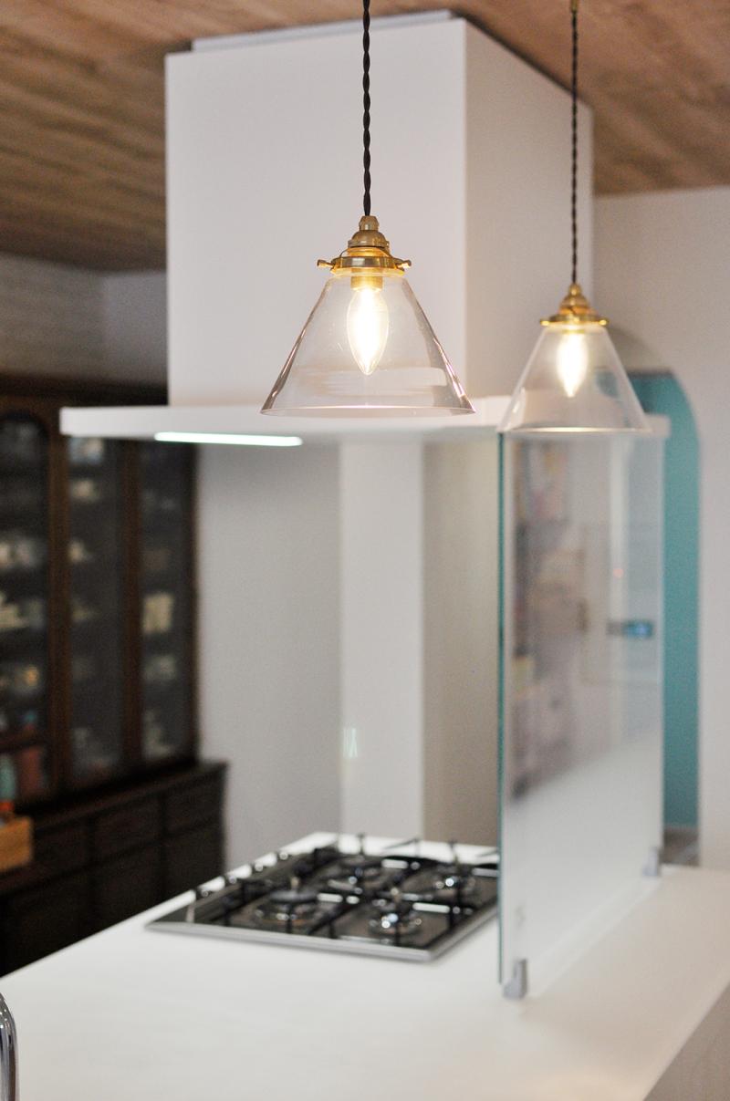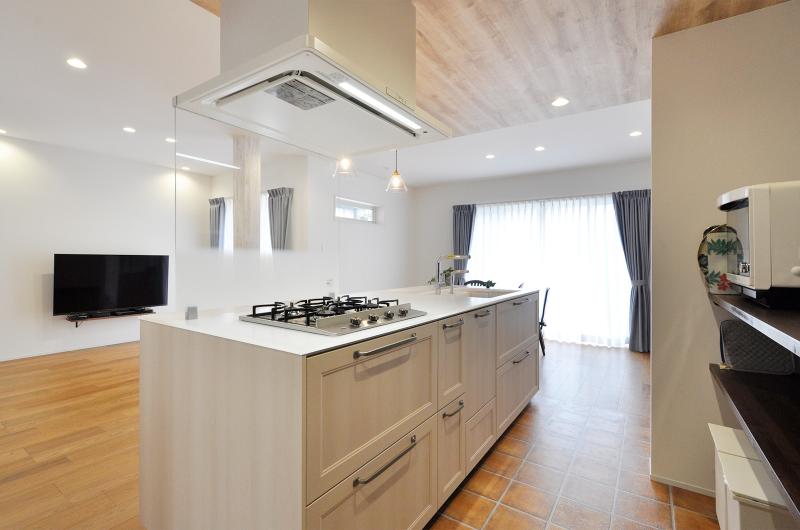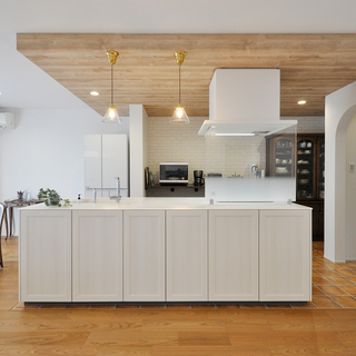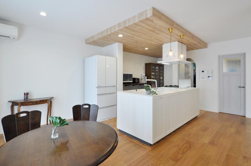 ホワイトカラーのフルフラットキッチン(TOTO/ザ・クラッソ)と、木目の下がり天井が目を引くアイランド型キッチン。ガラスタイプのレトロなペンダントライトは、奥様こだわりの逸品。背面収納カウンターは素朴な集成材、ホワイトレンガ柄のアクセントクロスでナチュラルな印象に