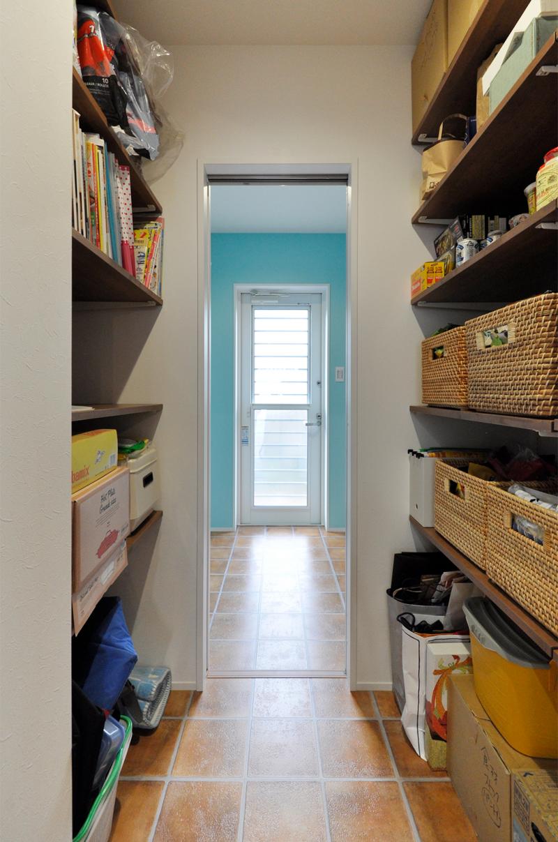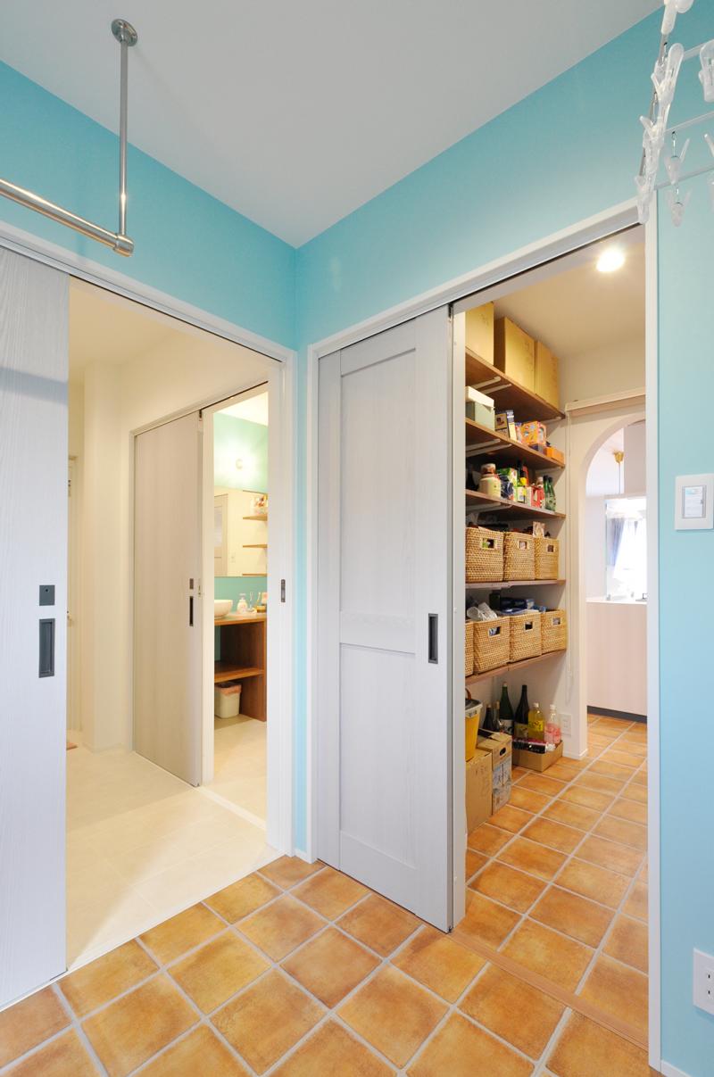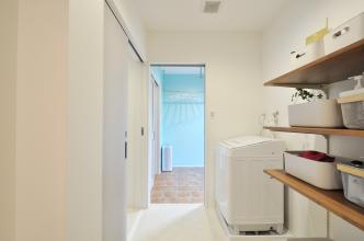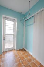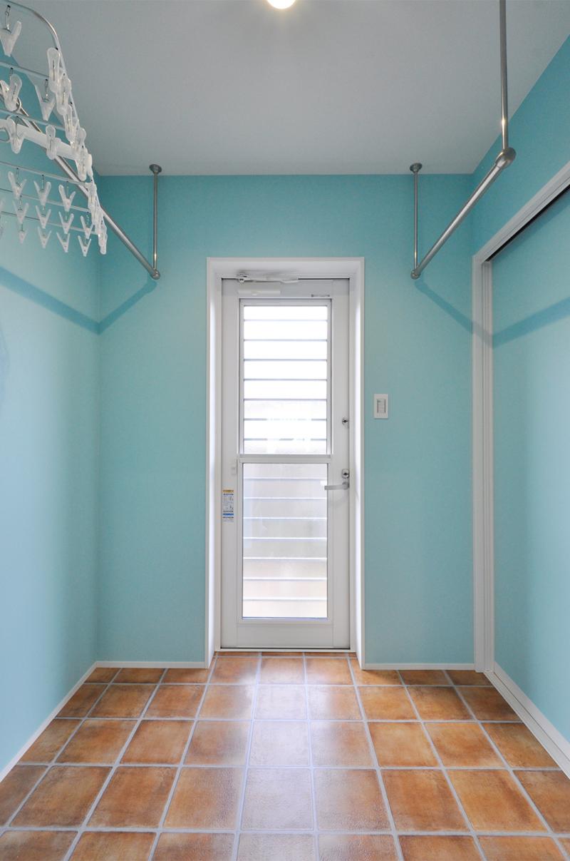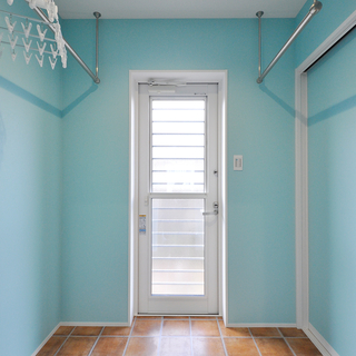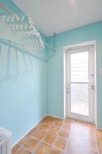 ティファニーブルーの壁紙とホワイトの勝手口が相性抜群のランドリースペース。洗濯機がある脱衣室のすぐ隣なので、サッと洗濯物が干せて梅雨のときなどに重宝します。