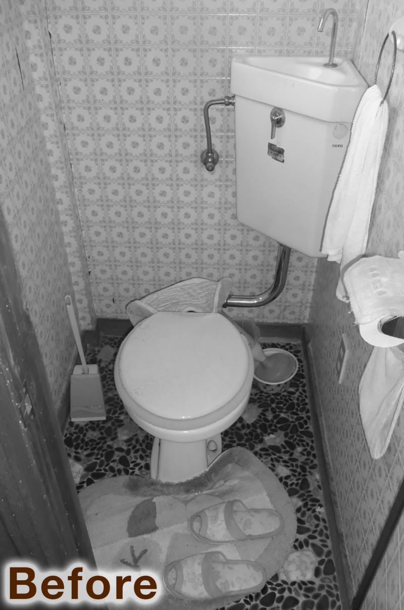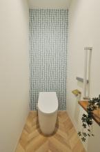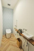 トイレはお母様も利用しやすいように以前より広めに空間を確保。ヘリンボーン調のクッションフロアとブルーのアクセントクロスでおしゃれな雰囲気に。タンクレスのTOTO/ネオレストAH1に長めの手洗いカウンターも設置しています。