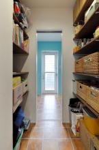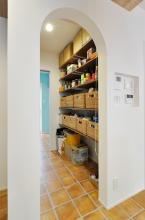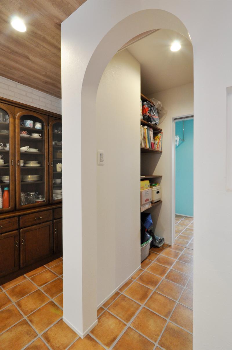 キッチン横は遊び心のあるアール開口の入り口が特徴のパントリースペース。奥のランドリースペースまでつながるテラコッタ調のフロアタイルが相まって欧州風な雰囲気に。壁にスイッチニッチを造作し、電子的なものをデザインでひとまとめにしています。