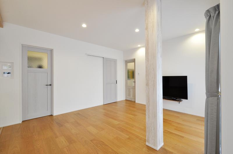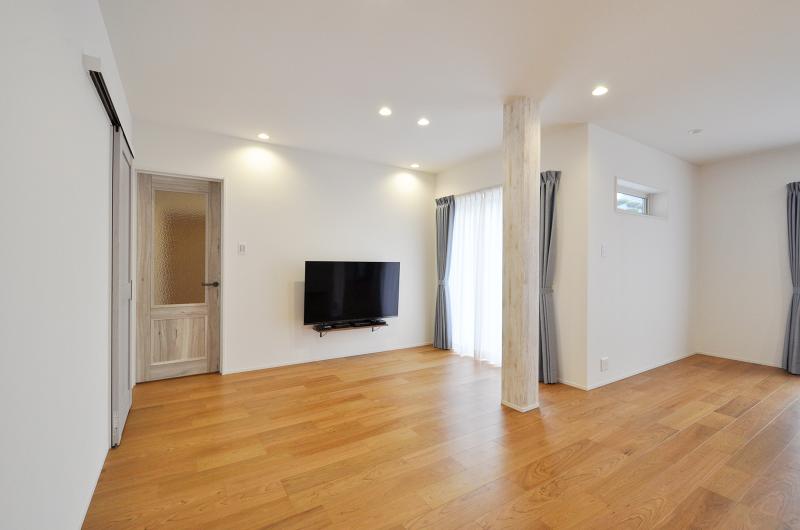 和室2間と居間をつなげた23帖の広いLDK。上質な幅広のブラックチェリー柄のフローリング(朝日ウッドテック/ライブナチュラル)と、リビングドアはアンティークガラスの入ったグレージュ色のデザインドア(LIXIL/ヴィンティアシリーズ)を組み合わせて温かみのある雰囲気に。リビングクロークに雑多なものは収納できるので、リビングはいつもスッキリと使えます。