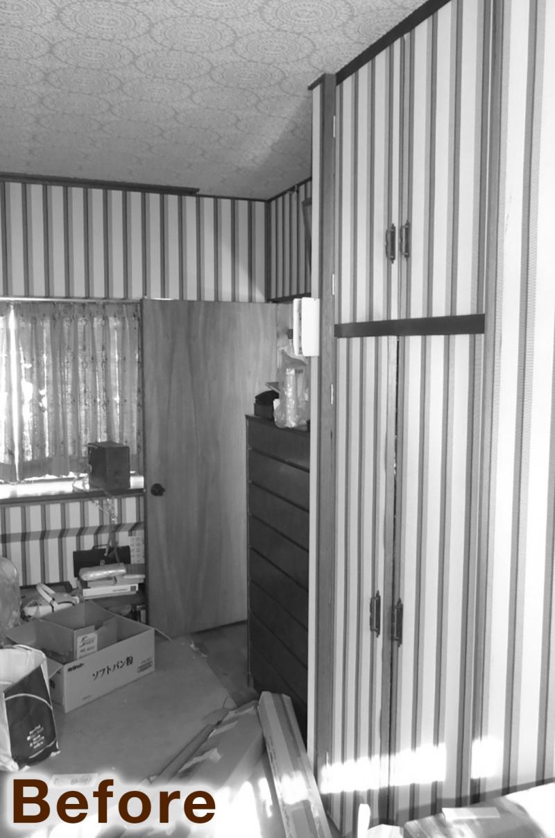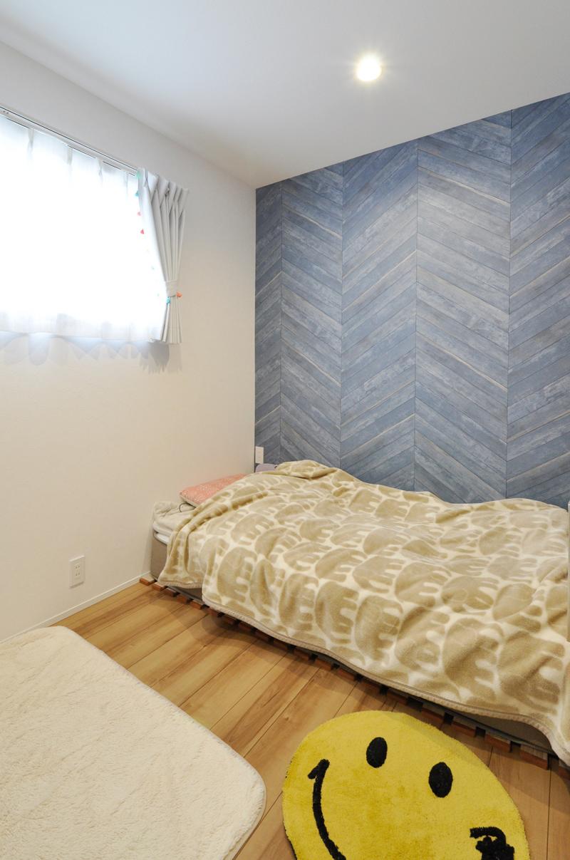 以前寝室になっていた空間を2つに分けて南側を子ども部屋、北側をウォークインクローゼットに。子ども部屋はネイビーのヘリンボーン調クロスがアクセントになっています。
