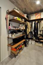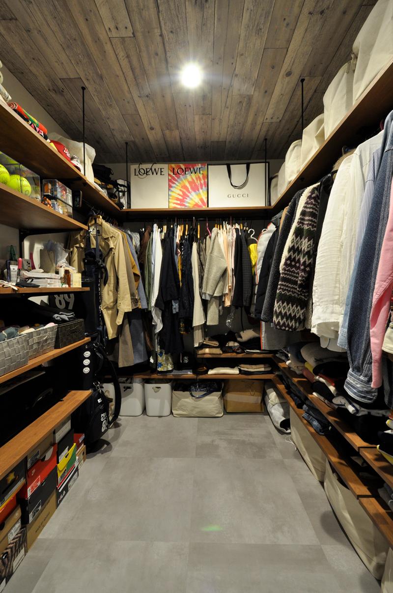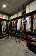 ウォールナット色の棚板とブラックの吊ボルトやブラケットで構成されたウォークインクローゼットは、シャビーな天井木目柄でインダストリアル風なショップのイメージに。