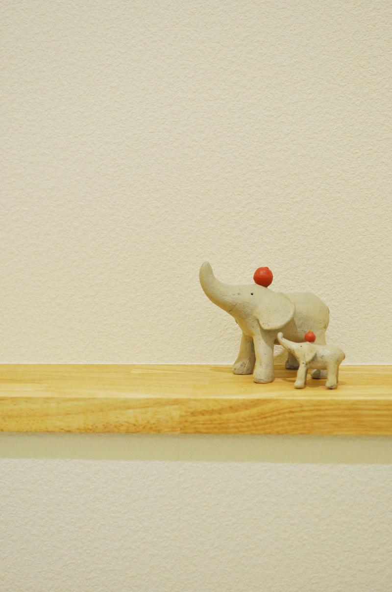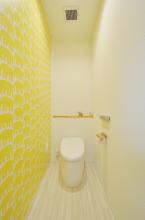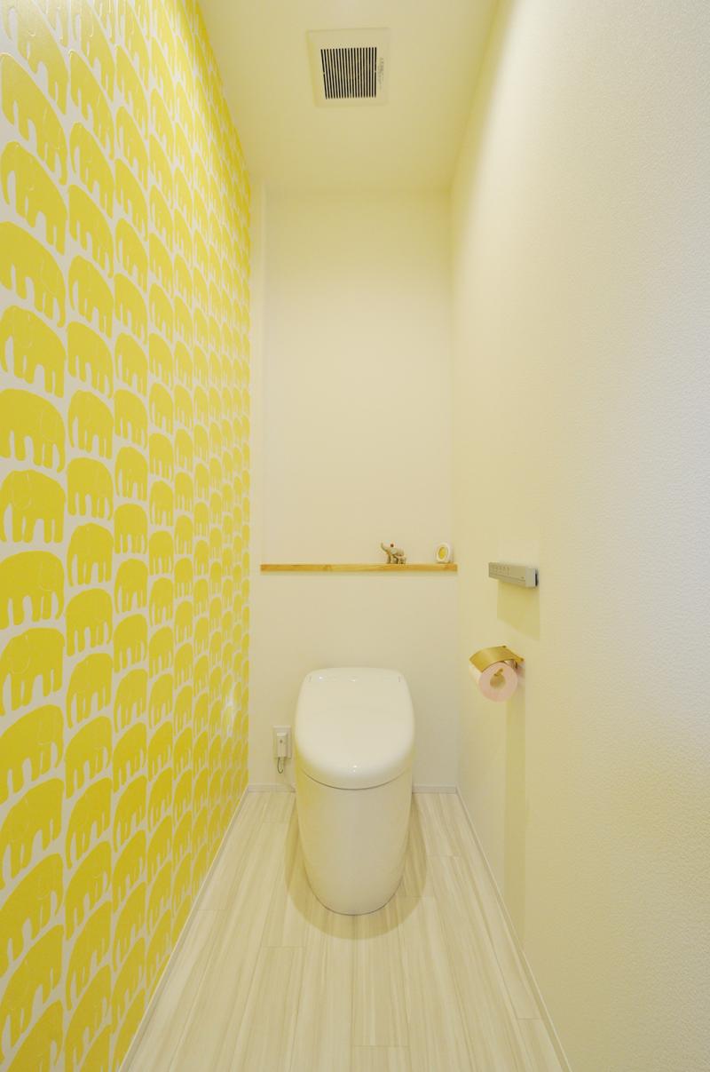 丸みのあるかわいい便器(TOTO/ネオレストRH1)とホワイトを基調にイエローのゾウ柄アクセントクロスが華やぐ、キュートな2階トイレ。ホールにはコンパクトながら洗練された手洗器も設置してます。