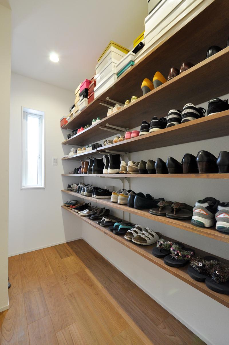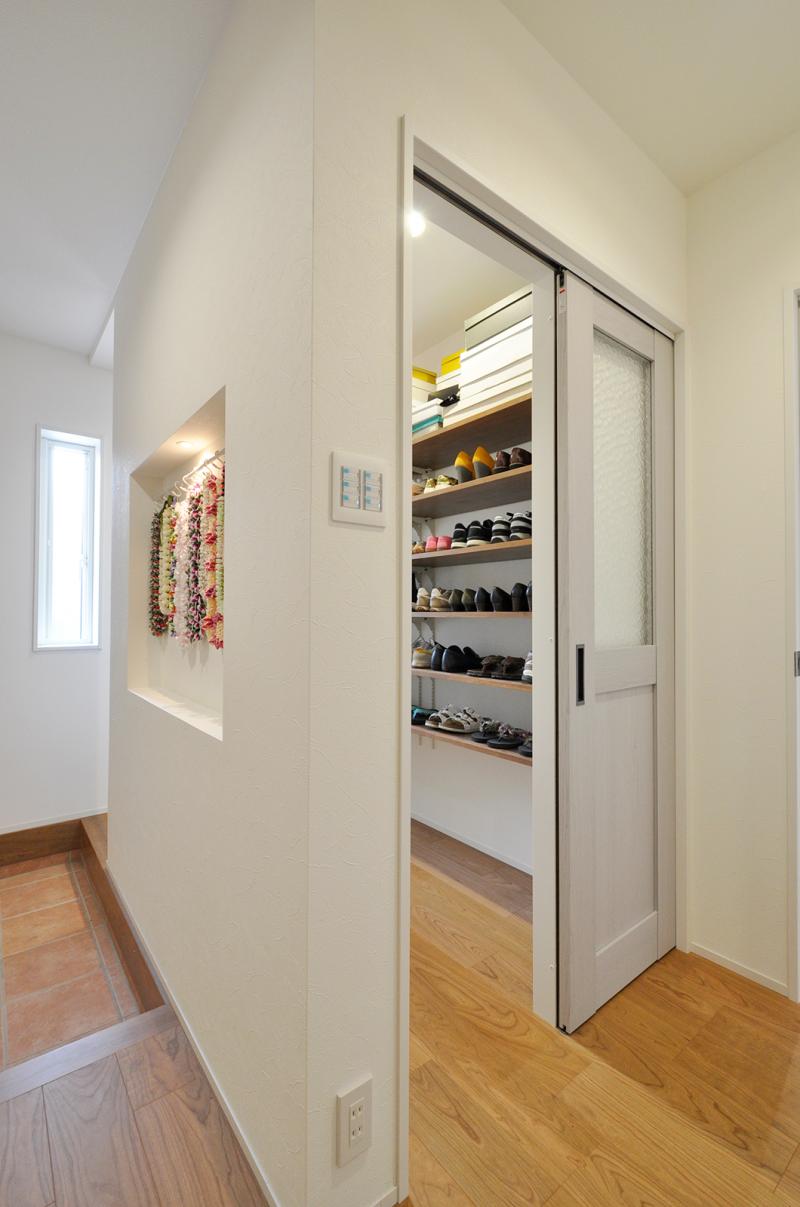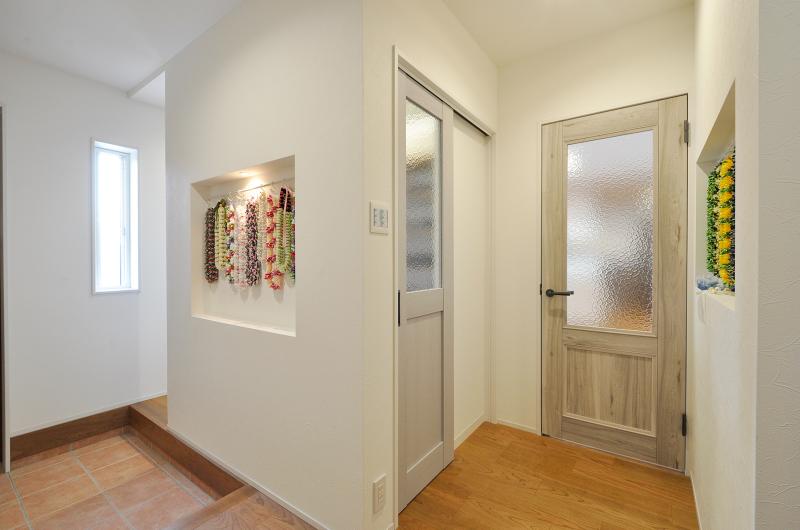 シューズクローゼットを併設したおかげで玄関はいつもスッキリと。玄関ドア(YKK/APヴィナートD30)、ポーチタイルもフローリングに合わせて茶系で統一。造作したニッチには奥様お手製のレイがディスプレイされ、玄関ホールに彩りをあたえてくれています。