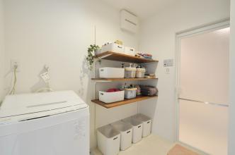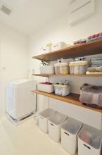洗面室から独立し、隣には大容量の洗濯物が干せるランドリースペースも併設する脱衣室。